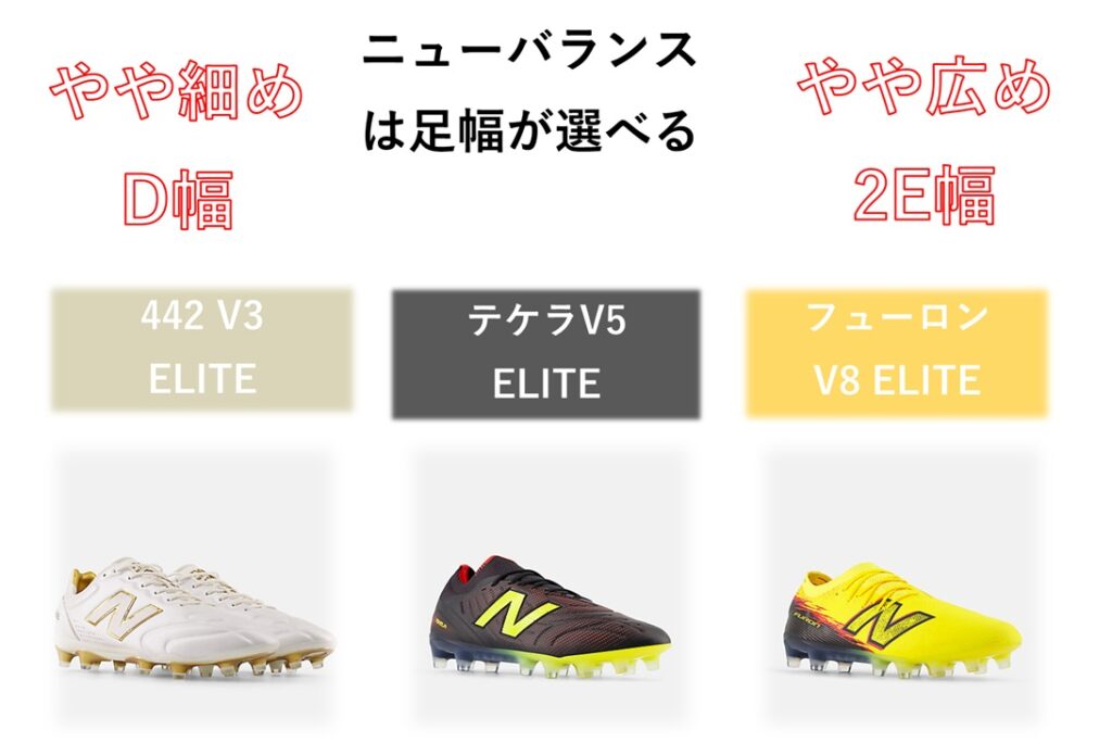 更に、ニューバランスのサッカースパイクは、試合用のELITEモデルだと足幅が2種類から選べる仕様。