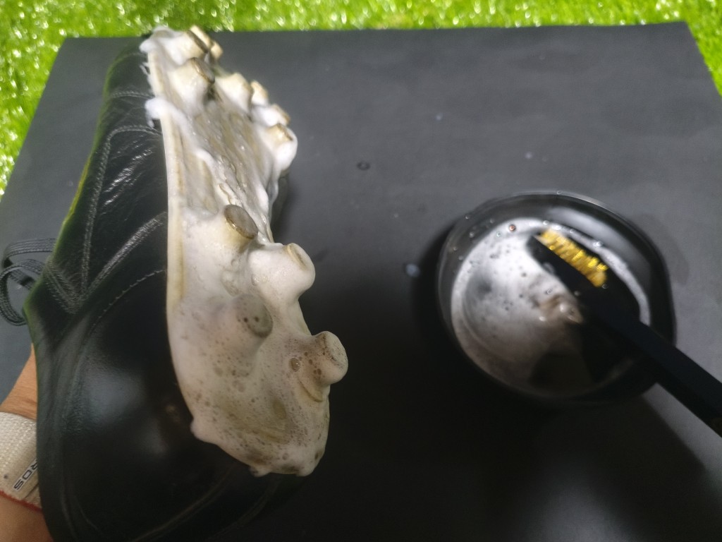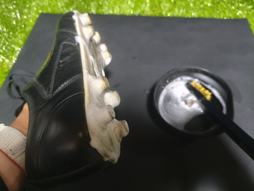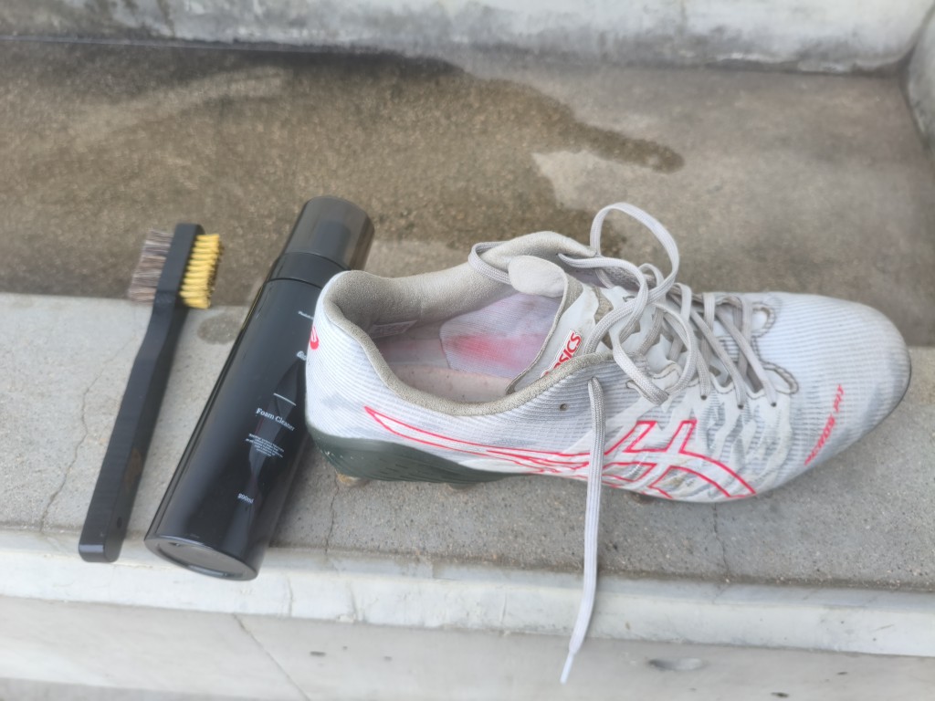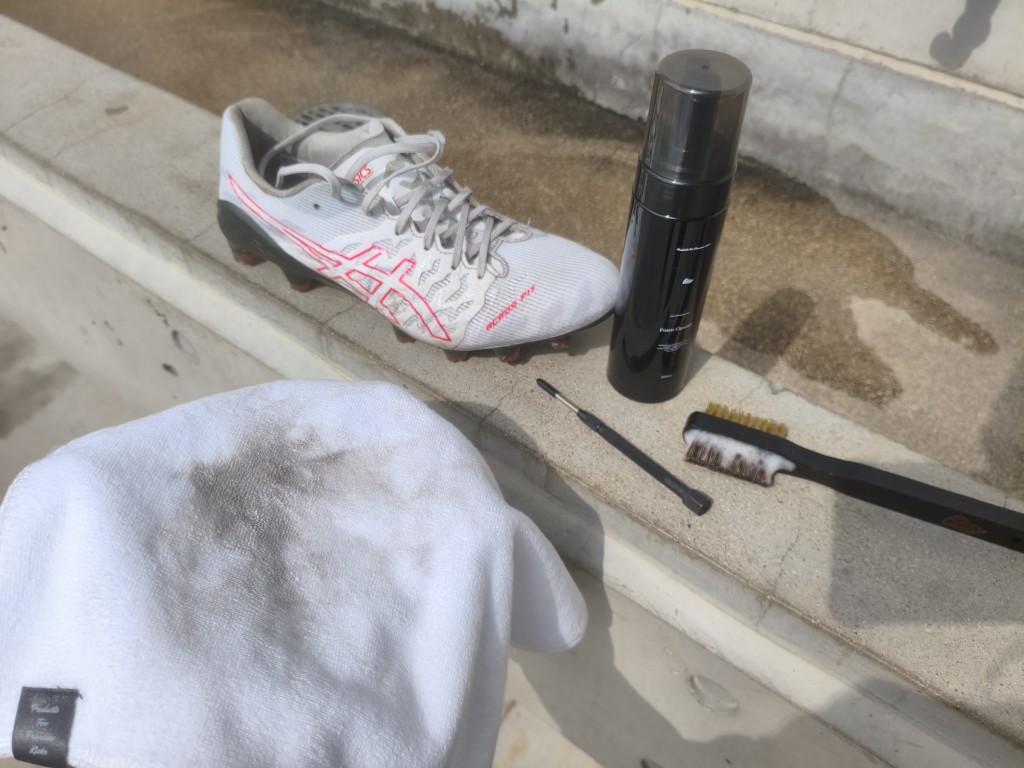 アシックスのサッカースパイク、ACROS3の右足をクリーナー、ブラシ、タオルでケアしてみました。