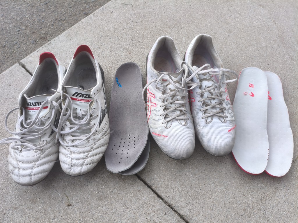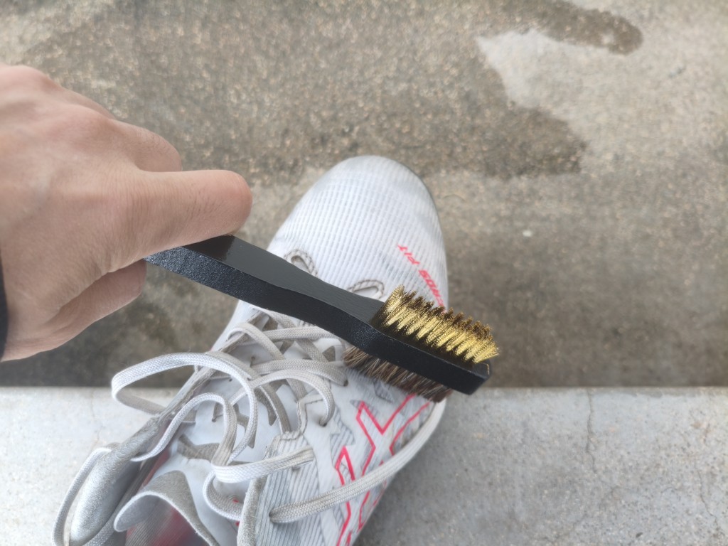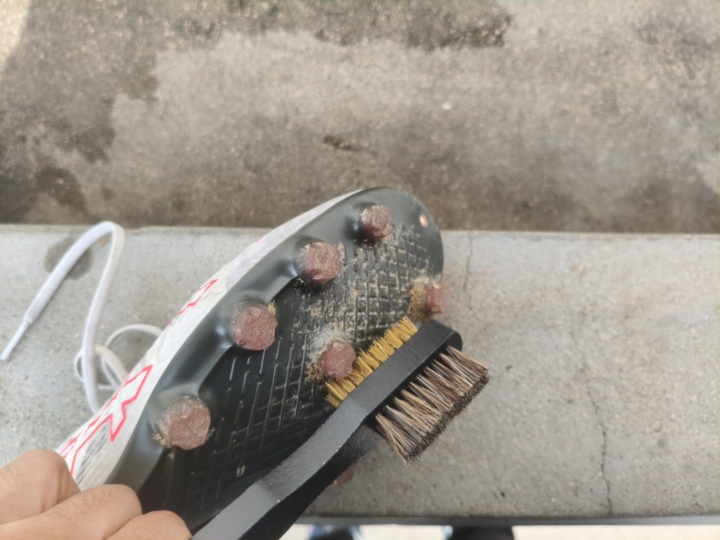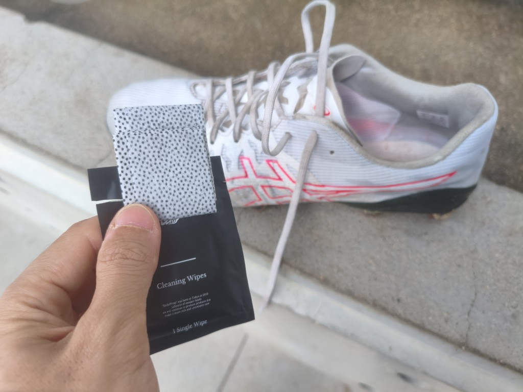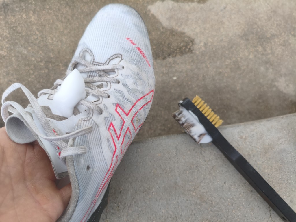 アシックスのサッカースパイク、ACROS3の右足をクリーナー、ブラシ、タオルでケアしてみました。
