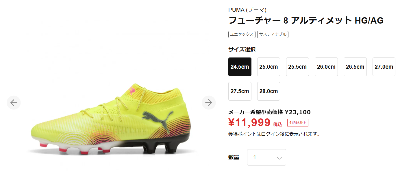 9/1限定 プーマ フューチャー8 イエローが激安価格で販売! お買い得情報 X Facebook はてブ LINE Pinterest コピー 2025.09.01 プーマのサッカースパイク、フューチャーシリーズ 現在最新モデルはフューチャー8ですが、 最大10%OFFクーポン 【8/30〜9/1】 プーマ FUTURE 8 ULT… 価格:11,999円(税込、送料別) (2025/9/1時点) pr このように旧カラーがセール価格、12000円で販売開始となっています。 また、9/1までは10%OFFクーポンも使えるので、更に安くなる模様。 PUMA プーマ フューチャー 8 アルティメット HG/AG [AUDACIT… 価格:11,990円(税込、送料別) (2025/9/1時点) pr PUMA プーマ フューチャー 8 アルティメット CREATIVITY AG … 価格:11,990円(税込、送料別) (2025/9/1時点) pr ちなみにフューチャー8は、結構どこもこれくらいの価格になっている印象。 モデルチェンジの噂も徐々に出てきてますが… それでも、これくらいの価格なら買いやすくて良いですね。 プーマ フューチャー8 アルティメット HG/AG 解説本日はプーマの新作スパイク、フューチャー8 アルティメット HG/AGの解説になります。 フューチャーシリーズの最新モデルで、今までのコントロール性を更に追及しているのがフューチャー8。 かなりアッパー部分に仕様変更が加わっている本作。 早... プーマ フューチャー8 アルティメット AG 解説本日はプーマの新作スパイク、フューチャー8 アルティメット AGの解説になります。 フューチャーシリーズの最新モデルで、今までのコントロール性を更に追及しているのがフューチャー8。 かなりアッパー部分に仕様変更が加わっている本作。 早速機能...