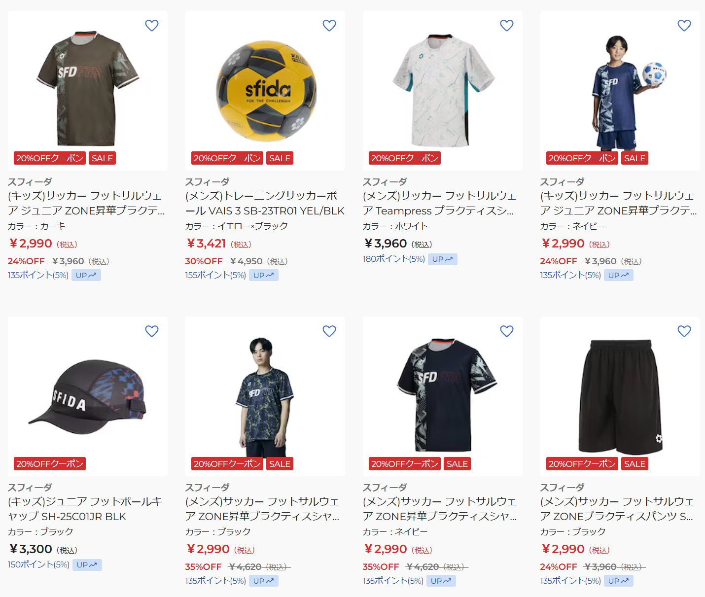 スフィーダだとサッカーボール、アパレルが中心で、一部シンガードなども対象。
