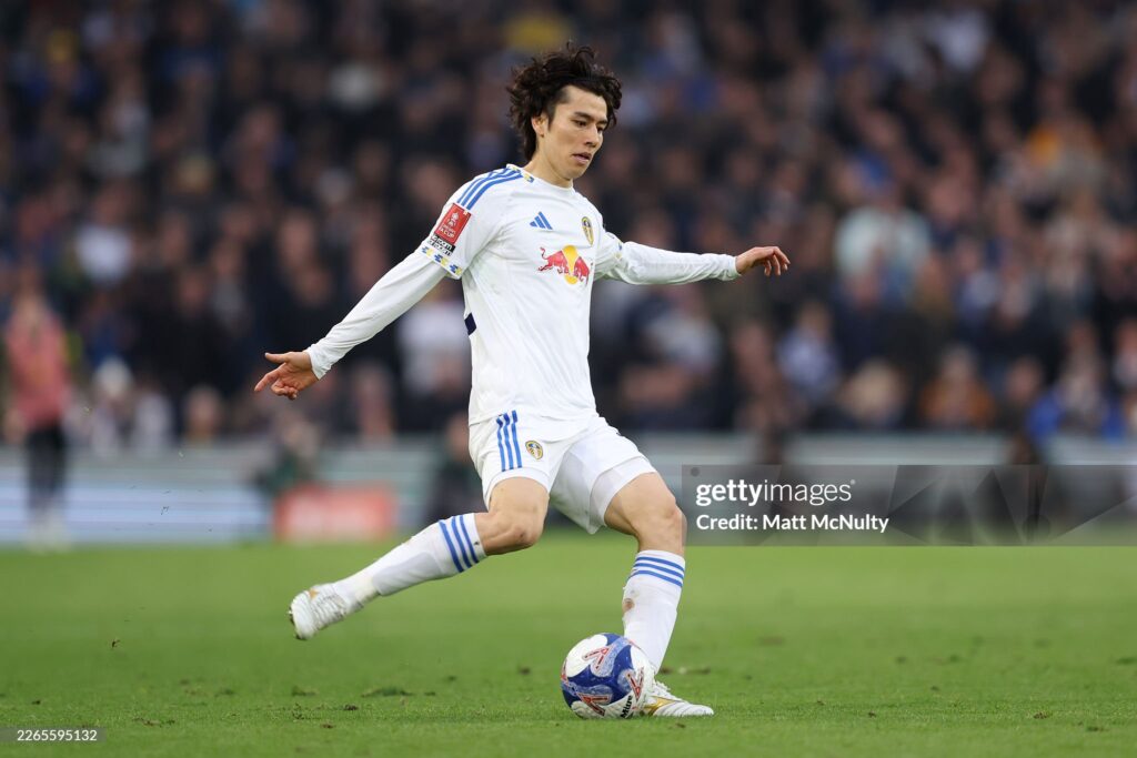 LEEDS, ENGLAND - MARCH 08: Ao Tanaka of Leeds United during the Emirates FA Cup Fifth Round match between Leeds United and Norwich City on March 08, 2026 in Leeds, England. (Photo by Matt McNulty/Getty Images)