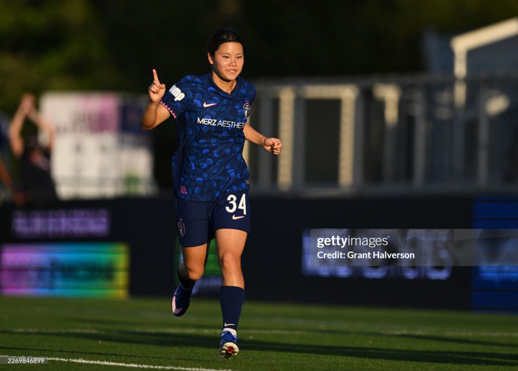 CARY, NORTH CAROLINA - APRIL 04: Manaka Matsukubo #34 of North Carolina Courage celebrates after scoring the team's first goal during the NWSL match between North Carolina Courage and Portland Thorns FC at First Horizon Stadium on April 04, 2026 in Cary, North Carolina. (Photo by Grant Halverson/NWSL via Getty Images)