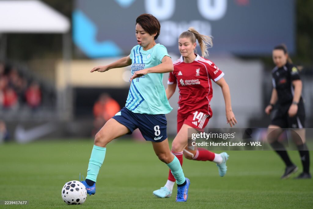 BROMLEY, ENGLAND - OCTOBER 05: Saki Kumagai of London City Lionesses in action during the Barclays Women's Super League match between London City Lionesses and Liverpool at Copperjax Community Stadium on October 05, 2025 in Bromley, England. (Photo by Harriet Lander - WSL/WSL Football via Getty Images)